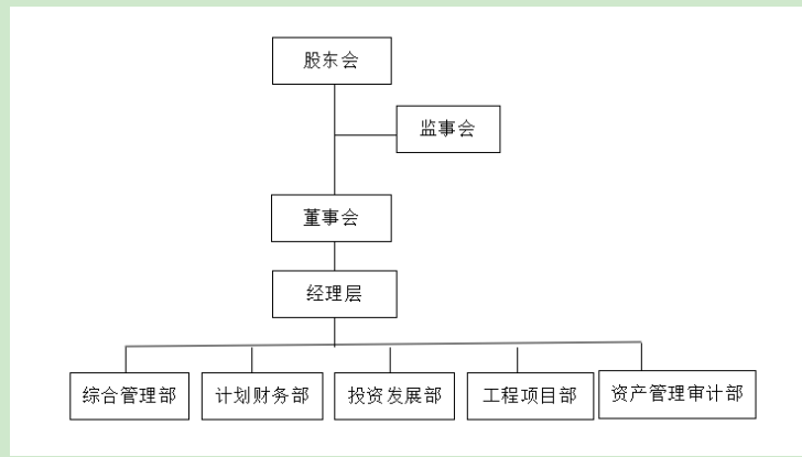 根據(jù)公司組建方案,公司目前設(shè)立了綜合管理部、計劃財務(wù)部、投資發(fā)展部、工程項目部、資產(chǎn)管理審計部5個部門。隨著公司的不斷發(fā)展,組織結(jié)構(gòu)設(shè)計也將會不斷進行改革和完善。公司依法依規(guī)成了黨支部、工會、團組織和婦聯(lián)組織。
