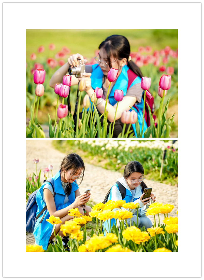 一天的旅程,學(xué)生們迎著春風(fēng)走進(jìn)天然氧吧木蘭天池,在欣賞峽谷風(fēng)光的同時(shí)觀看山水沉浸式演藝《木蘭少年志》,并在小天池、大天池等地合影留念。隨后便來(lái)到木蘭花鄉(xiāng)景區(qū),此時(shí)園中的郁金香已進(jìn)入盛花期,學(xué)生們或蹲下身子或在花道旁依次排開(kāi)留下青春的倩影。當(dāng)夜幕四合,已換上漢服的學(xué)子們穿梭在木蘭不夜城古色古香的街區(qū),品小吃看表演。