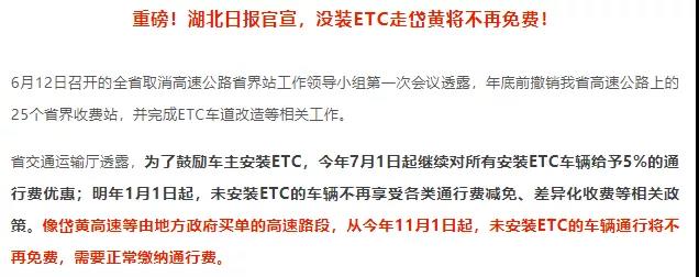 明年1月1日起,未安裝ETC的車輛不再享受各類通行費(fèi)減免、差異化收費(fèi)等相關(guān)政策。