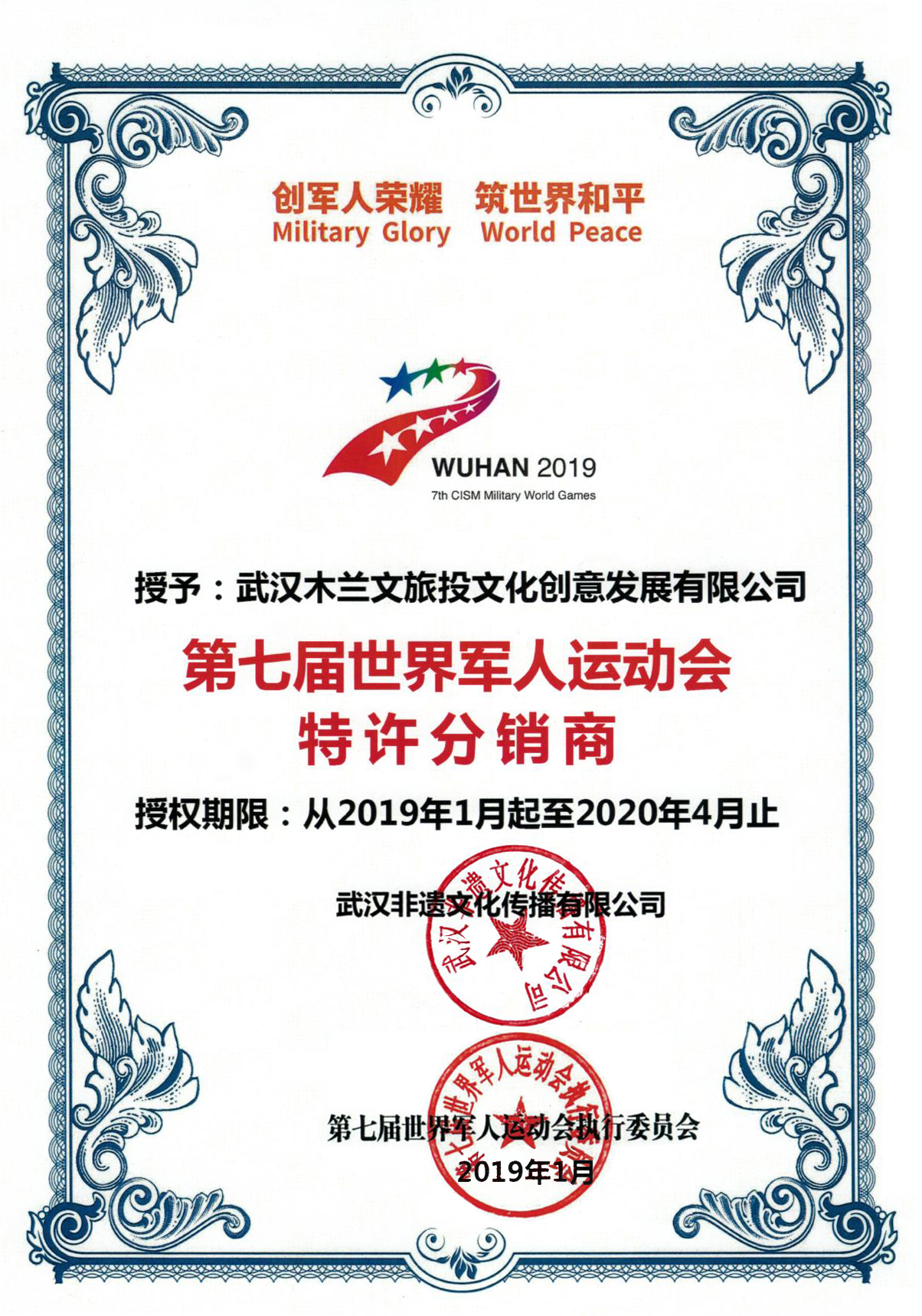 軍運會是世界盛會,更是黃陂幸事,自以軍運會吉祥物兵兵為主題的官方特許商品研發(fā)以來,武漢木蘭文旅投文化創(chuàng)意發(fā)展有限公司極度關注,并積極參與,在黃陂區(qū)委區(qū)政府和黃陂區(qū)軍運會籌委會的大力支持下,憑借自身實力和優(yōu)勢,于2019年元月份被第七屆世界軍人運動會執(zhí)行委員會授予黃陂地區(qū)第七屆世界軍人運動會特許分銷商,為黃陂區(qū)助力軍運,宣傳軍運及木蘭文化與軍運精神融合宣傳建立了更廣泛的營銷渠道。